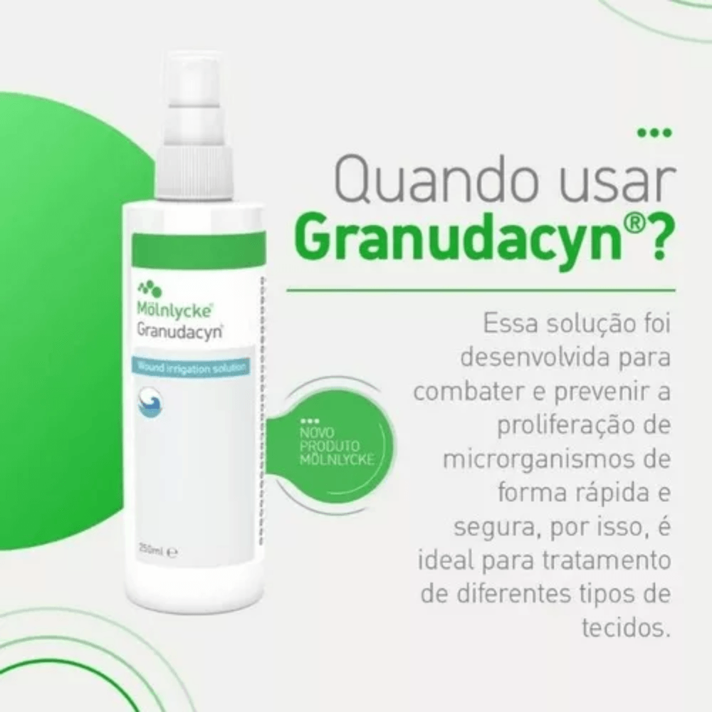 O Granudacyn - Solução de limpeza e irrigação de feridas é uma solução pronta para uso, para a limpeza e irrigação de feridas agudas, crônicas e contaminadas. A limpeza das feridas previne sua infecção. Em feridas já infectadas, a irrigação adjuvante da ferida pode ajudar a reduzir significativamente a carga microbiana, como resultado do efeito mecânico da irrigação, promovendo a cicatrização das feridas.Composição: Água, Cloreto de Sódio, Ácido Hipocloroso e Hipoclorito de Sódio.