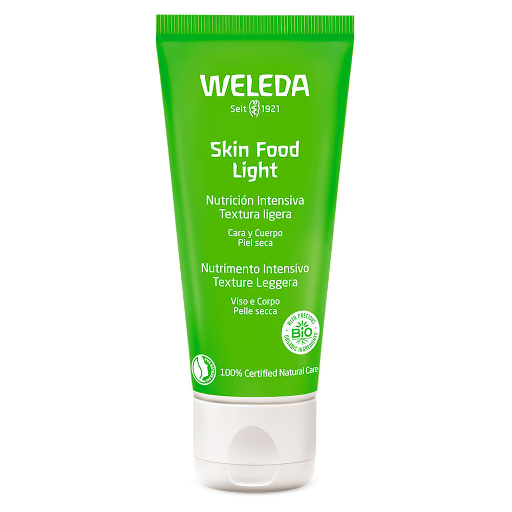 Skin food light – Weleda:Desfrute da experiência da nova linha Skin Food – inspirada no best-seller Skin Food Clássico, icônico desde 192. Skin Food Light hidrata e traz conforto imediato para a pele seca, que fica macia e suave após sua aplicação.Com textura leve, é rapidamente absorvido pela pele e ideal para ser usado várias vezes ao dia. Sua fórmula é uma exclusiva combinação de ativos naturais de origem orgânica que proporcionam hidratação imediata e regenera a barreira de proteção natural da pele. Pode ser aplicado no rosto e corpo. Skin Food Light traz conforto imediato para a pele seca. Uma loção leve e de rápida absorção, combina o Óleo de Girassol Orgânico com Extratos Calmantes para a pele de Amor-Perfeito, Camomila e Calêndula.Sua pele sentirá a hidratação instantânea, enquanto sua textura leve regenera a própria barreira protetora da pele, protegendo-a de ressecar. O companheiro ideal quando você está em movimento, absorvendo rapidamente e deixando a pele macia, sedosa e pronta para tudo.Benefícios do Produto:> Fácil aplicação e absorção.> Hidratação imediata para pele seca.> Alívio e conforto imediatos para pele seca.> Ideal para o Dia a Dia.> Ingredientes orgânicos e 100% naturais.> Dermatologicamente testado. Livre de fragrâncias artificiais, matérias-primas derivadas de óleos minerais, corantes e conservantes sintéticos.> Agricultura Sustentável e Fornecimento Ético.Orgânico, Natural e Cruelty Free