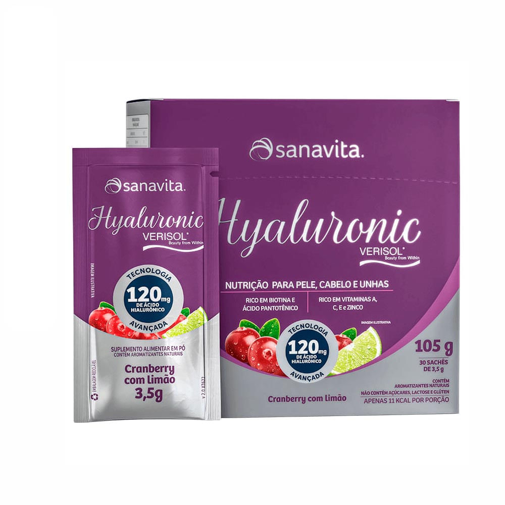 O Hyaluronic Verisol Cranberry e Limão Sanavita 105g com 30 sachês, possui fórmula exclusiva e diferenciada, devido à associação de peptídeos bioativos de colágeno com 100% das necessidades diárias das vitaminas A, C, E , ácido pantotênico, biotina e zinco, que potencializam a nutrição de dentro para fora.