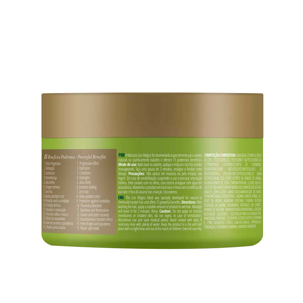 A Máscara Liso Mágico foi desenvolvida especialmente para cabelos naturais ou químicamente tratados. Com formulação vegana, à base de extrato de jasmim, que hidrata, elimina o frizz e alinha os fios naturalmente além de oferecer 15 poderosos benefícios.Características:Botânico e Vegano - Efeito progressivo hidratação, ultra Brilho.Resultado: Selagem extrema - Zero frizz - Ajuda a proteger a cor - Efeito liso instantâneo.Modo de Uso:Após lavar os cabelos, aplique a máscara nos fios úmidos massageando, faça uma pausa de 3 minutos, enxágue. Finalize como desejar.Cuidados:Mantenha fora do alcance de crianças. Em caso de sensibilização, suspenda o uso e procurar orientação médica. Em caso de contato com os olhos, lavar com água em abundância. Não usar em mucosas, uso externo. Se ingerido não provocar vomito e consultar um médico. Guardar em local seco e fresco sem incidência de luz e calor.