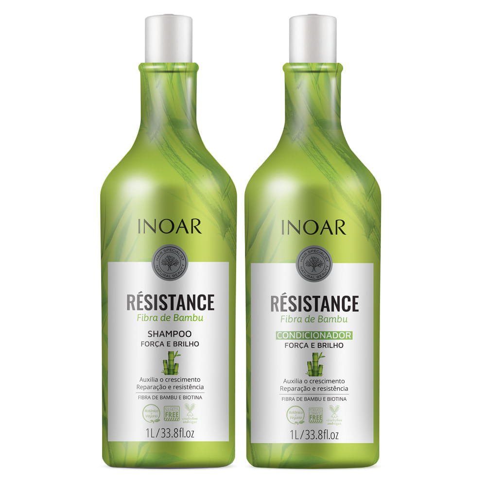 O Kit Contém:1 Shampoo Résistance Fibra de Bambu - 1L1 Condicionador Résistance Fibra de Bambu - 1LEnriquecido com Fibra de Bambu, rica em proteínas e selênio, Inoar Résistance Fibra de Bambu repara cabelos enfraquecidos e fortalece os fios, deixando-os com muito mais brilho. Sua composição contém Biotina, vitamina que estimula o crescimento e trata os fios de dentro para fora, com poder rejuvenescedor.Além da fibra de bambu, também possui em sua composição a Biotina, uma vitamina que estimula o crescimento e trata os fios de dentro para fora, e ainda é um poderoso rejuvenescedor capilar.Para cabelos danificados.Benefícios:- Força e Brilho;- Auxilia o Crescimento;- Resistência e Reparação.Ativos:- Fibra de Bambu: Força- Biotina: Auxilia no crescimento.Diferenciais:- Ingredientes naturais: que faotalecem e hidratam os fios, deixando-os leves, bonitos e sedosos. - Bambu: repara os fios enfraquecidos e e fortalece.Modo de Usar:Shampoo Résistance Fibra de BambuAplicar o shampoo nos cabelos molhados, massagear e enxaguar a seguir. Se necessário, repita a operação.Condicionador Résistance Fibra de BambuApós lavar os cabelos com shampoo, aplicar o condicionador Plástica Capilar por todo o cabelo. Enxágue em seguida.A Marca:A Inoar é uma marca brasileira de produtos cosméticos que exporta para mais de 40 países e criadora de tratamentos exclusivos para cabelos. Tendo iniciado suas atividades em 1999, é referência no mundo da cosmética para cabelos e, hoje, está presente nos melhores salões e nas mãos dos mais renomados hairstylists.