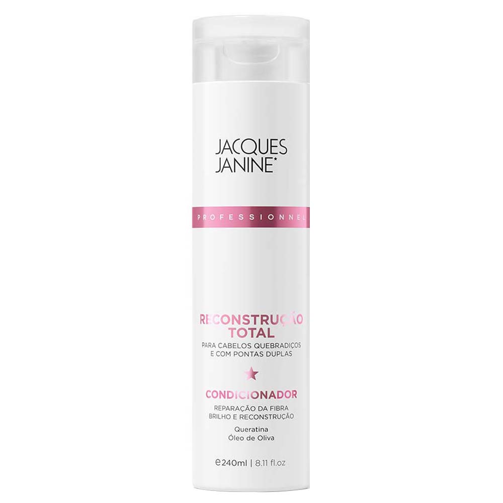 O Condicionador Recosntrução de Jacques Janine Professionnel é ideal para cabelos quebradiços e com pontas duplas. Ele promove uma reparação intensa dos cabelos danificados, quebradiços e com pontas duplas. O Condicionador Reconstrução repõe as proteínas nos fios frágeis e sensibilizados, deixando os cabelos fortes e com vitalidade. O condicionador, além de desembaraçar, promove a reparação e reconstrução das fibras capilares, protegendo os cabelos contra a quebra e novas agressões. Indicado: Cabelos quebradiços e com pontas duplas.Benefícios:• Reparação da fibra;• Antiqueda;• Hidratação e Brilho.Ativos:• Queratina: É uma proteína que hidrata e repõe alguns nutrientes que os cabelos danificados perdem.• Óleo de semente de girassol: Hidrata e dá brilho, deixando o cabelo leve.• Óleo de oliva: Hidrata, reduz o volume e o frizz.Resultados: Cabelos hidratados e com brilho.Modo de Usar: Após lavar o cabelo com o Shampoo Reconstrução total, espalhe o condicionador em suas mãos e aplique sobre os cabelos úmidos, massageando do comprimento até as pontas, deixe agir de 3 a 5 minutos e enxágue completamente. Sobre a Marca:Jacques Janine Professionnel foi criada pelo casal Jacques e Janine Goossens, que carregava a excelência dos mais de 55 anos da renomada rede de salões Jacques Janine. A linha Jacques Janine Professionnel representa uma revolução na indústria de cosméticos, ao unir qualidade, valores e excelência dos serviços na fabricação de cosméticos. Os produtos são desenvolvidos com alta performance, sendo adequados aos diferentes desejos e necessidades de profissionais e consumidores finais.