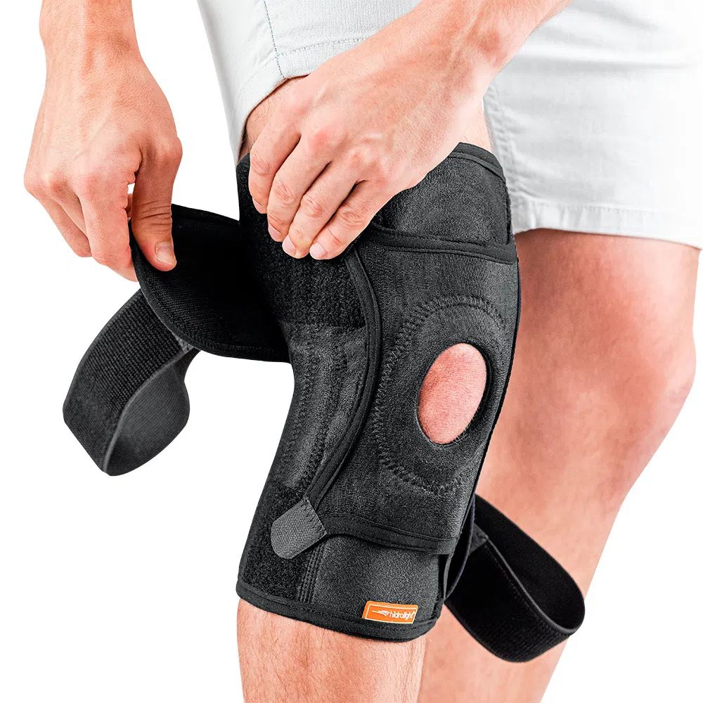 Envolva a joelheira ao redor do joelho, posicionando o orifício sobre a patela. Ajuste as tiras conforme necessário para garantir um encaixe firme, mas confortável, assegurando que a joelheira fique bem posicionada e não restrinja a circulação.