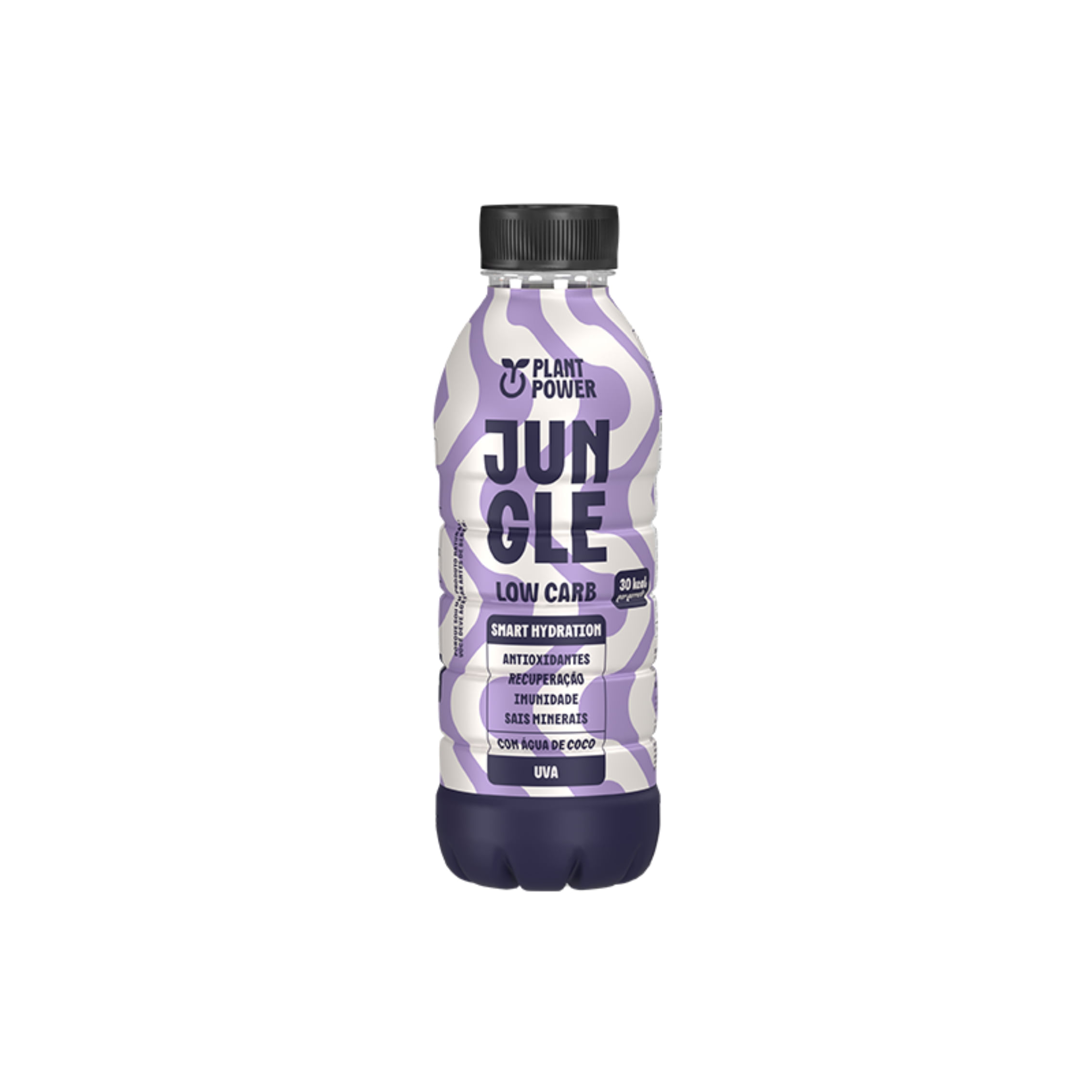 A bebida funcional Jungle Low Carb sabor uva, da Plant Power, é elaborada com água, suco de uva concentrado, água de coco, suco de limão e sal marinho para reposição energética e de eletrólitos perdidos com a transpiração.