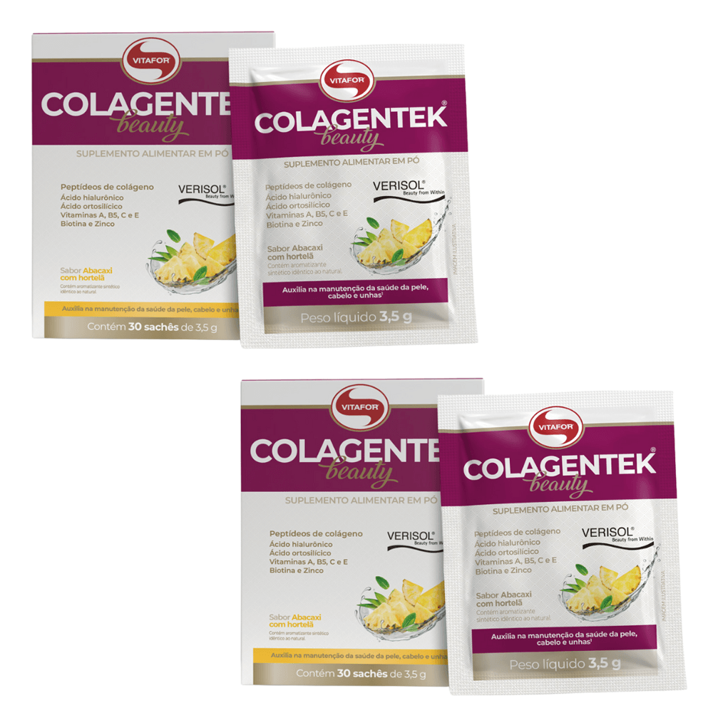 KIT 2 COLÁGENO VERISOL COLAGENTEK BEAUTY ABACAXI C/ HORTELÃ VITAFOR 30 SACHÊS CADA