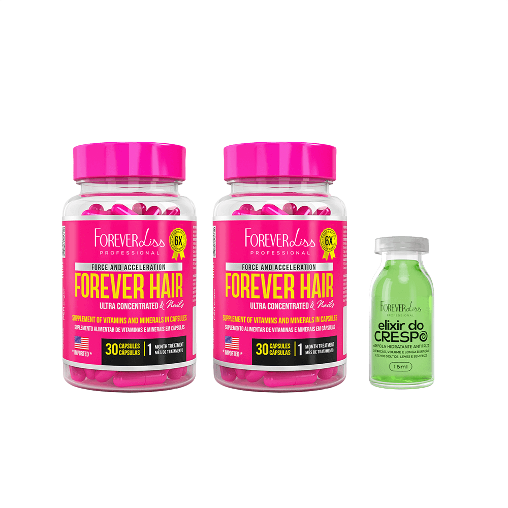 O Kit Forever Hair + Brinde Ampola Elixir do Crespo Forever Liss é a combinação ideal para quem busca fortalecer os fios de dentro para fora, promovendo crescimento saudável e cuidado intensivo. O suplemento Forever Hair é um complexo vitamínico 100% natural, que nutre e fortalece os cabelos e unhas, sem causar ganho de peso. Como brinde, a Ampola Elixir do Crespo oferece hidratação profunda e definição para cabelos crespos e crespíssimos.