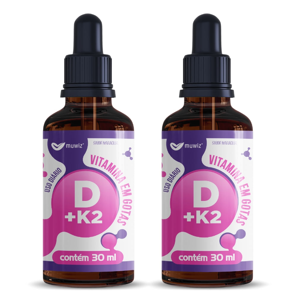 A Kit 2x Vitamina D3 + K2 em Gotas Muwiz fornece uma quantidade bem alta de vitamina D ao seu organismo. Conhecida como a vitamina do sol, a vitamina D faz parte do grupo de micronutrientes, substâncias de extrema importância para as funções biológica. A vitamina D é muito importante para o corpo humano. Além de suas funções mais conhecidas relacionadas à saúde dos ossos, é responsável também por outras atividades, trabalhando como reguladora do crescimento, sistema imunológico, cardiovascular, músculos, metabolismo e insulina.A vitamina K2 tem a importante função de dirigir o cálcio para as zonas corretas do corpo, para que nutra os ossos e os dentes. Ao mesmo tempo, evita que se produza uma calcificação e que o cálcio se deposite nos lugares onde não é desejado, como podem ser as artérias e outros tecidos moles do corpo.