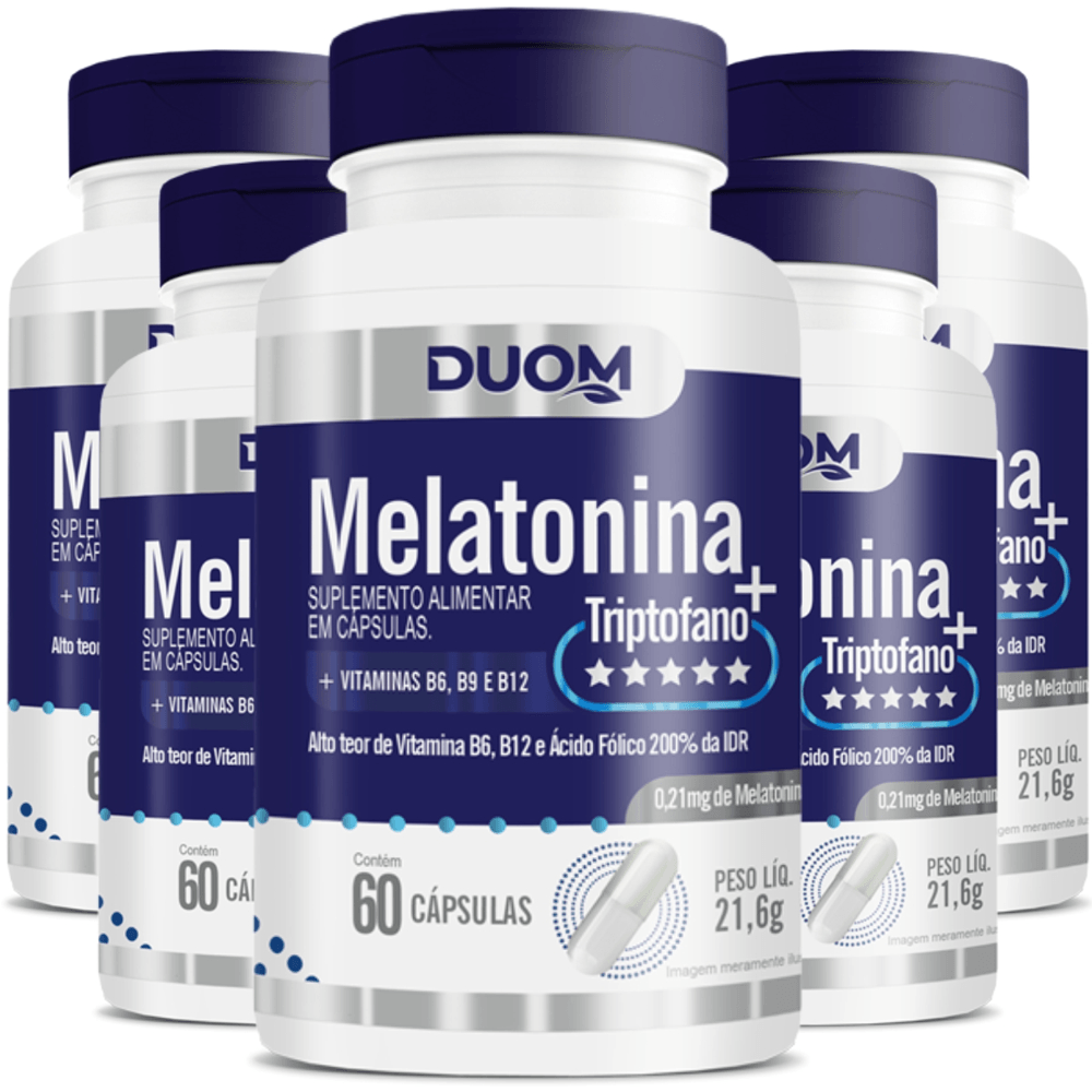 Kit 5x Melatonina + Triptofano + Vitaminas B6, B9 e B12 – 60 Cápsulas Cada – Total 300 Cápsulas – Duom