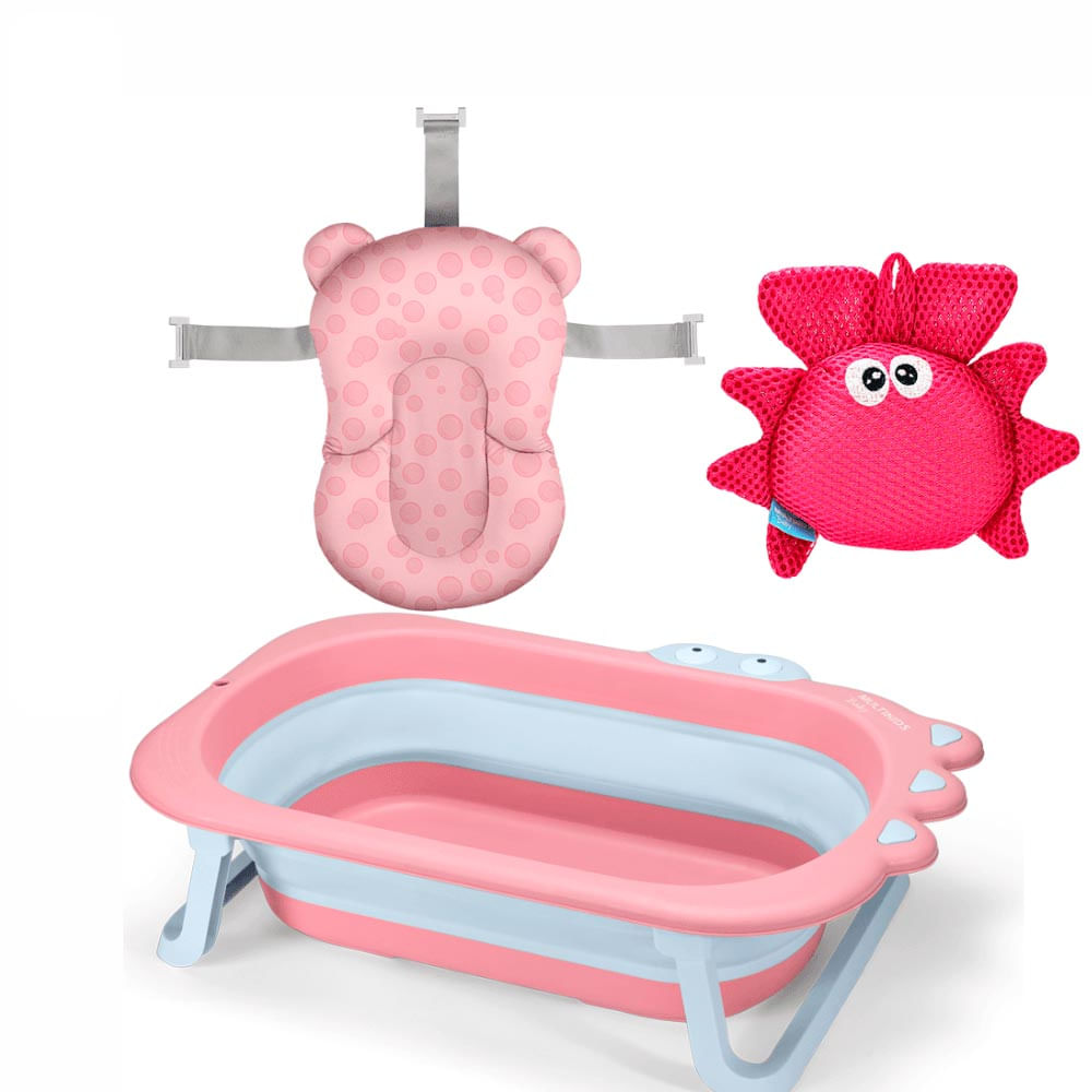 Kit Banheira Retrátil Com Almofada E Esponja Multikids Baby Rosa