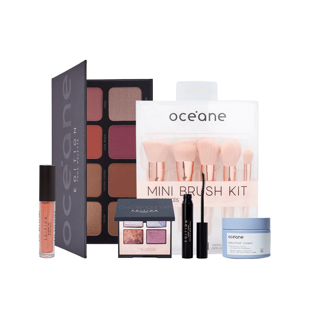 O Kit Blush em Bastão + Fixador de Maquiagem + Lápis para Olhos + Lip Tinted + Paleta de Sombras é composto por 5 produtos essenciais para criar uma maquiagem completa e duradoura.