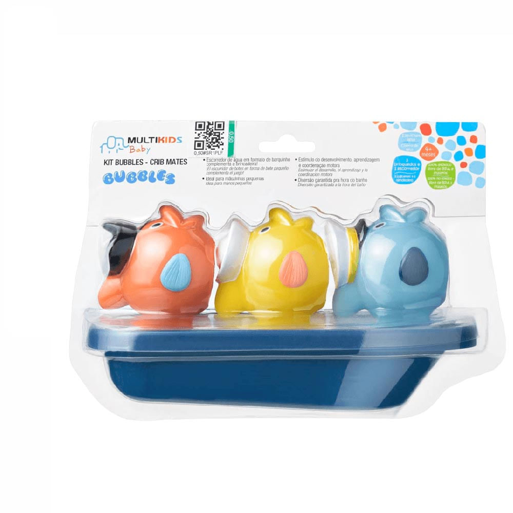 Através das brincadeiras e atividades na hora do banho, você estimula o desenvolvimento, aprendizagem e coordenação motora, além de transformar esse momento em pura diversão! A Linha Bubbles é 100% atóxica, feita com materiais livres de BPA e Ftalatos que oferecem segurança para você e para o seu bebê. Conta com produtos leves e do tamanho ideal que, além de flutuar na água, cabem nas mãozinhas dos pequenos. O Kit CribMates da linha Bubbles vem com três brinquedos que esguicham água e um barquinho que além de animar a brincadeira, pode ser usado de escorredor de água para ajudar a tirar o shampoo da cabecinha do bebê.
