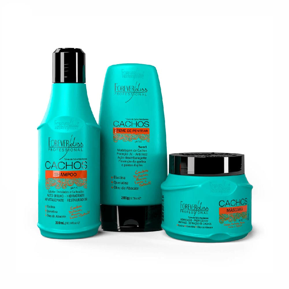O Kit Cachos com Shampoo, Máscara 250g e Creme de Pentear Forever Liss ajuda a disciplinar fios cacheados que estão ressecados, sem definição, muito volumosos e com excesso de frizz.