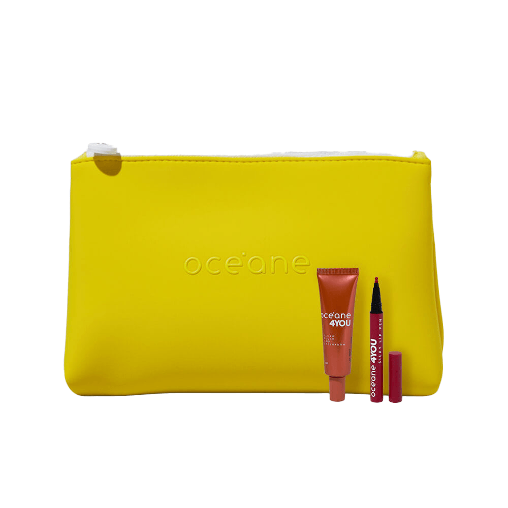 Kit Caneta Batom Rosa + Blush Líquido Laranja + Nécessaire Neoprene 4you Amarela