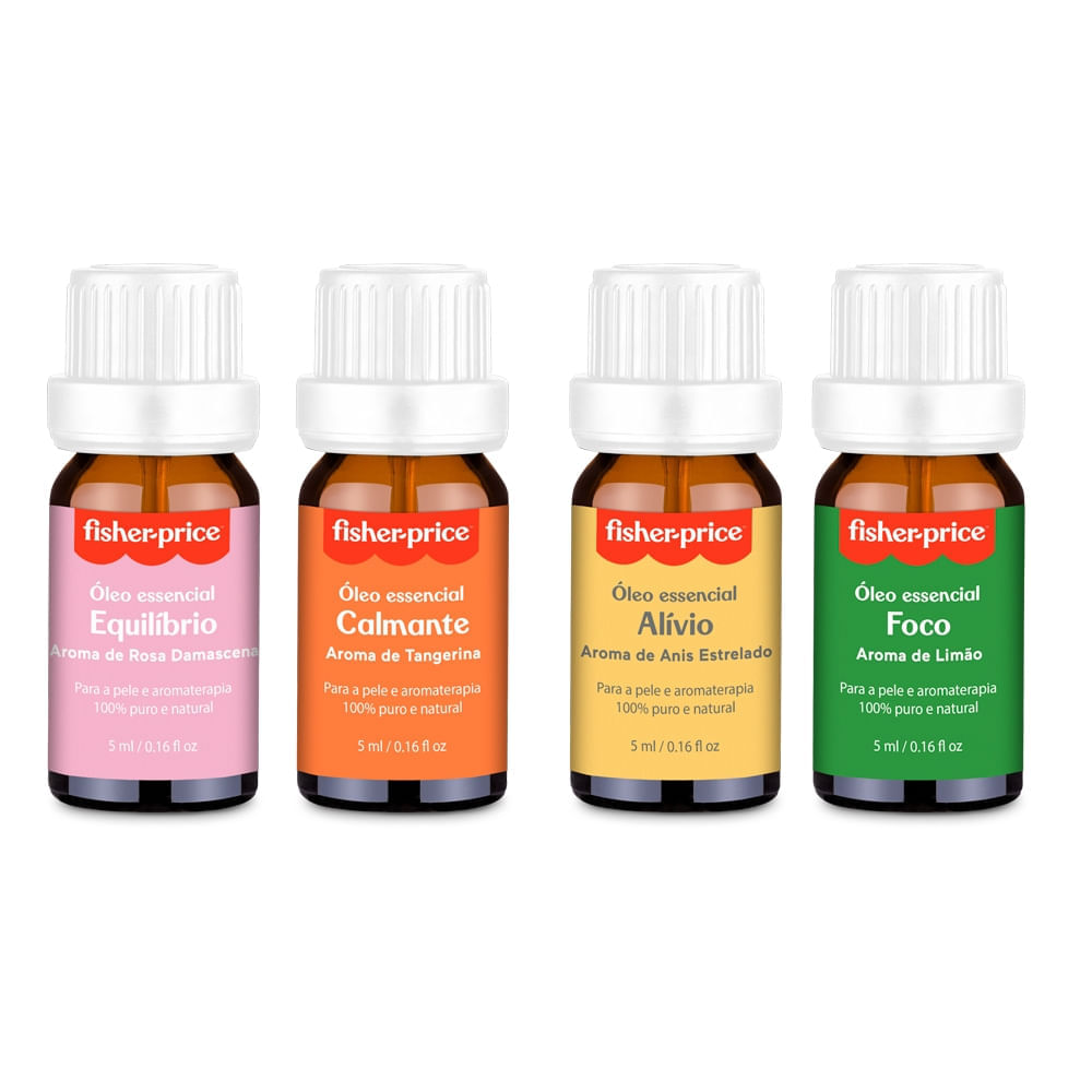 Os óleos essenciais proporcionam a você e para a sua família várias sensações de conforto e bem estar. Através dos aromas dispersos no ambiente ou misturados com produtos de pele ou cabelo, eles podem lhe oferecer momentos mais relaxantes e conectados com você e sua casa. Como usar os óleos essenciais Fisher-Price? Você pode usar os óleos de diferentes maneiras: Na massagem: Misture algumas gotas com o seu óleo de massagem preferido; No banho: Pingue algumas gotas do óleo na sua banheira cheia de água;Na pele e cabelo: Adicione uma gota do óleo nos produtos preferidos da sua rotina de skin care;Na aromaterapia: Pingue de 2 a 3 gotas do óleo no local indicado do seu difusor ou umidificador. Equilíbrio - Aroma de Rosa Damascena Equilibra as emoções, diminuindo irritabilidade e tensões; Proporciona um ambiente mais calmo, diminuindo a ansiedade; Auxilia na boa qualidade do sono. Calmante - Aroma de Tangerina Proporciona um ambiente mais calmo, amenizando o sentimento de ansiedade e hiperatividade; Auxilia no processo digestivo e na respiração. Alívio - Aroma de Anis Estrelado Auxilia nas crises respiratórias em bebês e crianças; Auxilia na redução dos gases e cólicas dos bebês; Auxilia no estímulo de colágeno.Foco - Aroma de Limão Auxilia no foco e atenção e autoconfiança; Repelente natural contra mosquitos e auxilia no sistema imunológico.Imagens meramente ilustrativas.