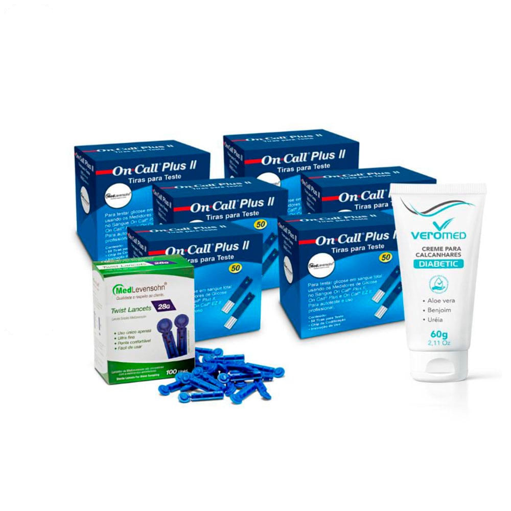 O kit é ideal para pessoas com diabetes e inclui ferramentas essenciais para monitorar a glicemia e cuidar dos pés. Ele contém um monitor de glicemia On Call Plus II, 300 tiras para teste de glicose, 100 lancetas Medlevensohn e um creme para calcanhares ressecados e rachados.