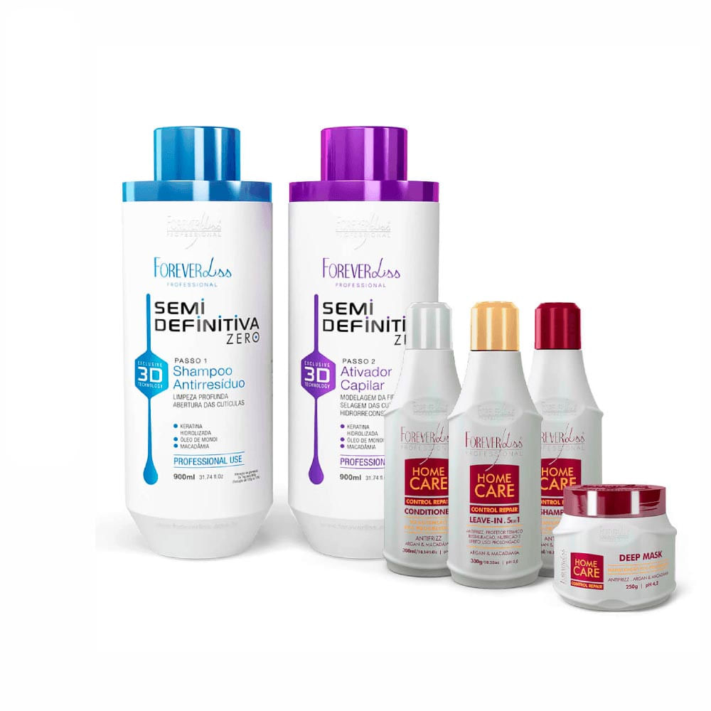 Semi Definitiva Zero 3D 2x900ml com Kit Pós Progressiva Forever Liss promove cabelos completamente selados, disciplinados, soltos, leves, macios, com brilho intenso, volume controlado e completamente livre do frizz por um longo período.