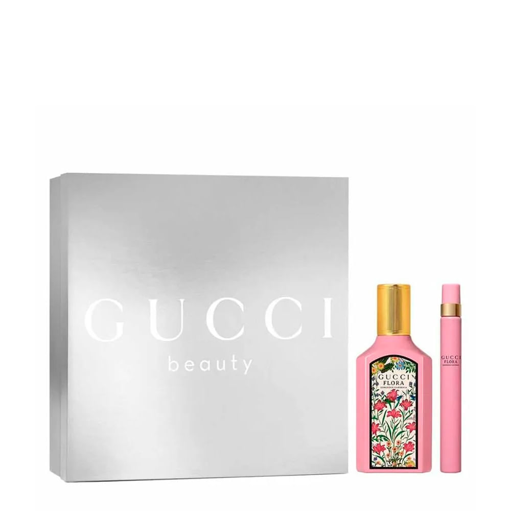 O Kit Gucci Flora Gorgeous Gardenia EDP Feminino 50ml + 10ml, lançado em 2021, é uma fragrância floral frutada que celebra a alegria, autenticidade e feminilidade livre, com Miley Cyrus como embaixadora.