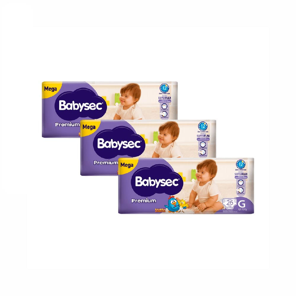 Kit com 3 pacotes Babysec Premium G com 26 unidades cada