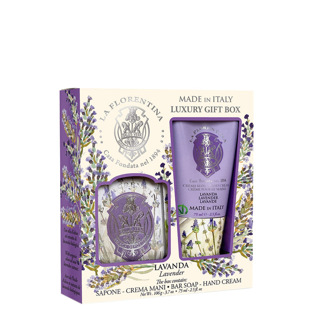 O produto é um kit da La Florentina, que inclui um creme para as mãos de 75 ml e um sabonete em barra de 106 g, ambos com fragrância de Lavanda.