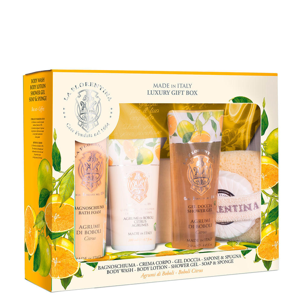 O produto é um kit de spa da marca La Florentina, com a fragrância Boboli Citrus, que inclui vários itens para cuidados corporais.