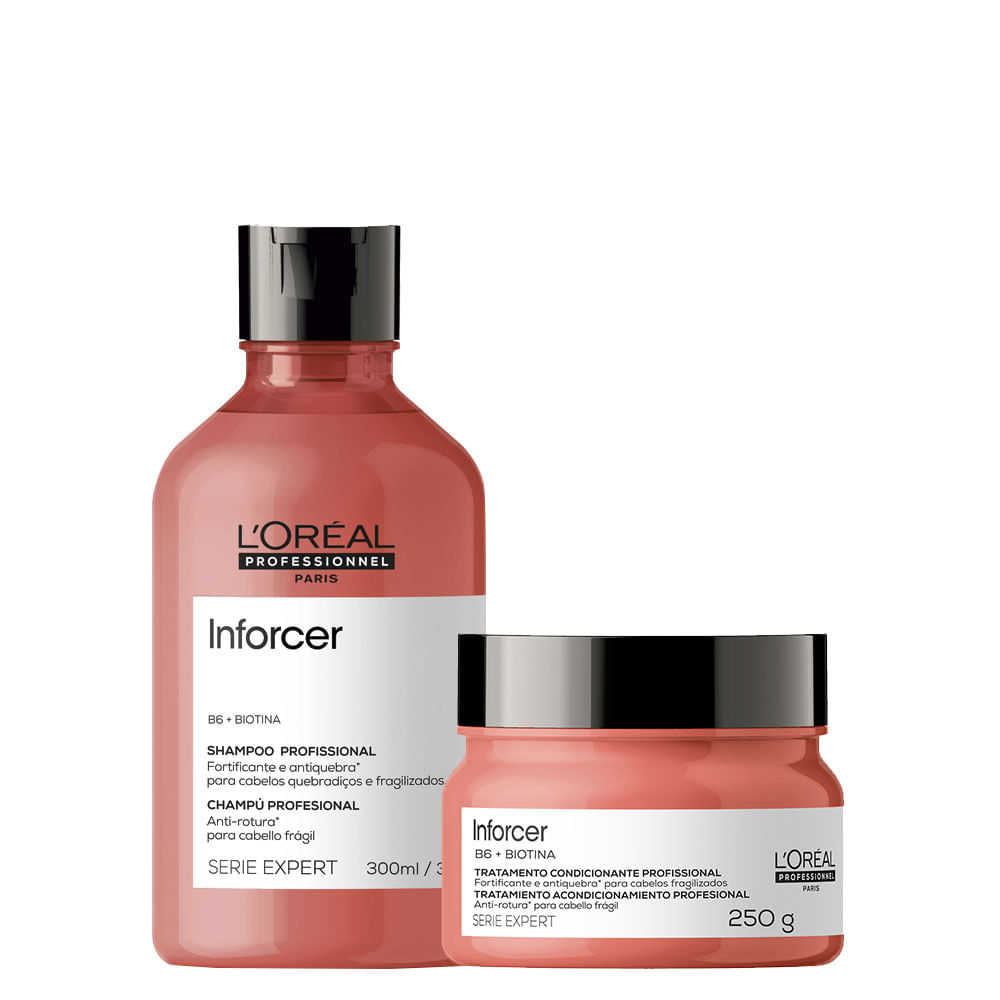 O Kit L'Oréal Professionnel Serie Expert Inforcer contém 1 Shampoo de 300 ml e 1 Máscara de 250 gramas.