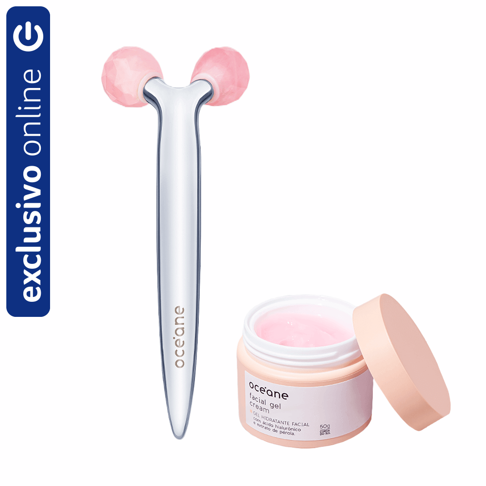 - Kit composto por um massageador facial de quartzo rosa e um gel hidratante facial