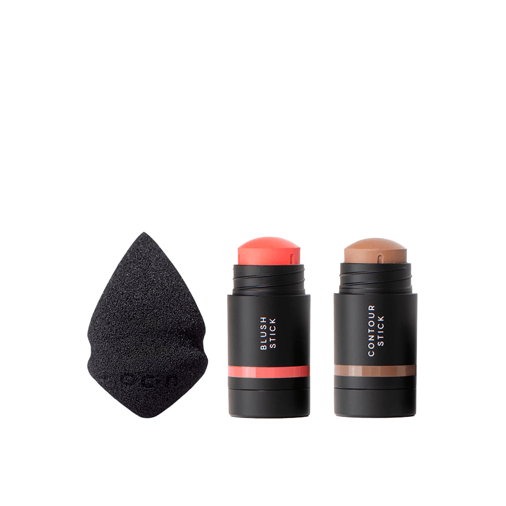 Kit Mini Blush Em Bastão Coral + Mini Contorno Em Bastão Marrom Médio + Mini Esponja De Maquiagem Océane Edition