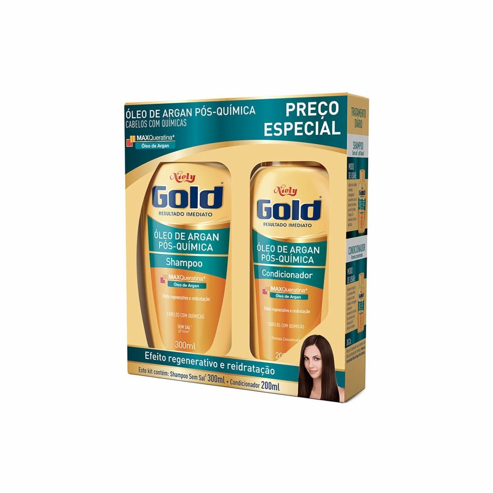 - O Shampoo + Condicionador Niely Gold Óleo de Argan Pós Química é indicado para cabelos que possuem escovas progressivas e processos químicos.