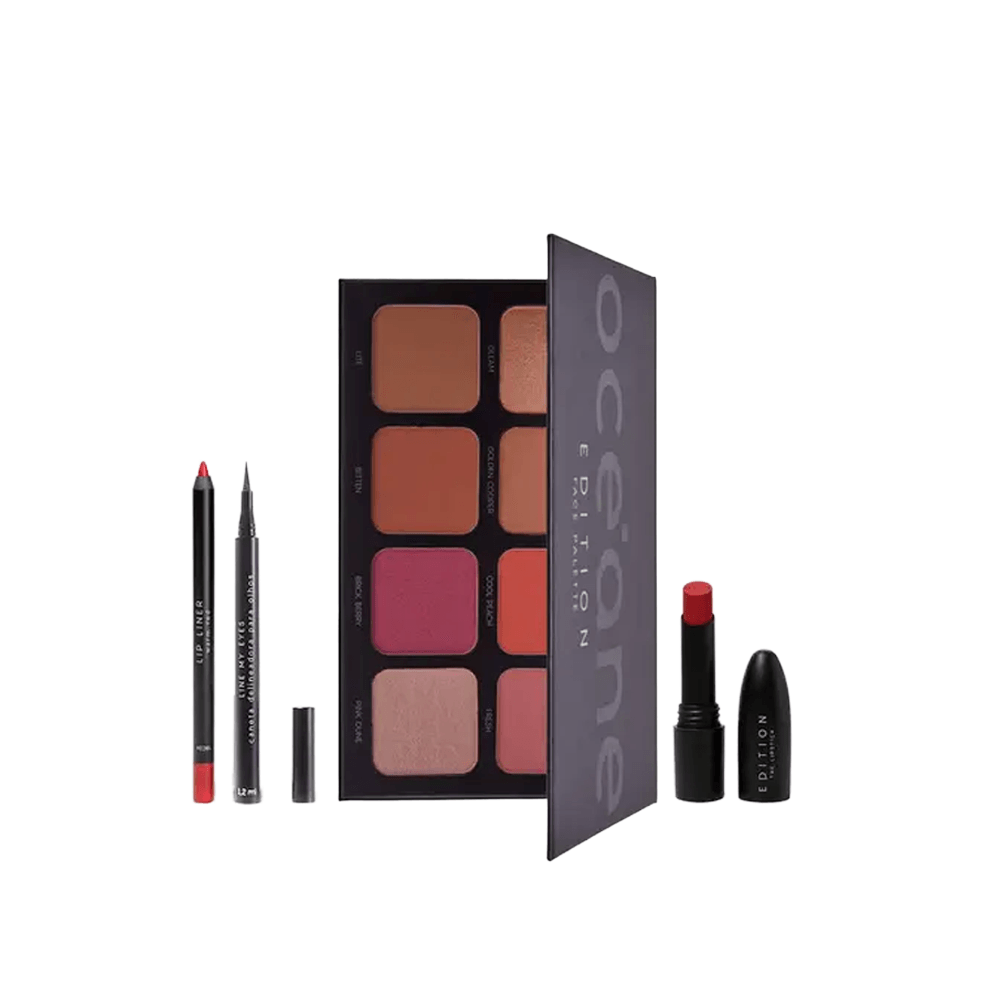 O Kit Paleta Multifuncional + Batom Vermelho + Lápis Labial + Caneta Delineadora Océane Edition reúne 4 produtos essenciais da linha Océane Edition para criar uma maquiagem completa, com alta pigmentação e longa duração.