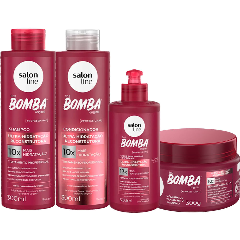 A Linha S.O.S Bomba Ultra Hidratação Reconstrutora conta com uma fórmula poderosa, enriquecida com Ácido Hialurônico, Niacinamida e Queratina Vegetal, que age profundamente para hidratar intensamente os fios por até 72 horas, combatendo o ressecamento e o frizz, deixando seus fios macios, sedosos, com brilho, desembaraço, finalização e proteção. Reconstrói os danos causados por químicas, colorações, ferramentas de calor e agressores externos, restaurando a força e a resistência dos seus cabelos.