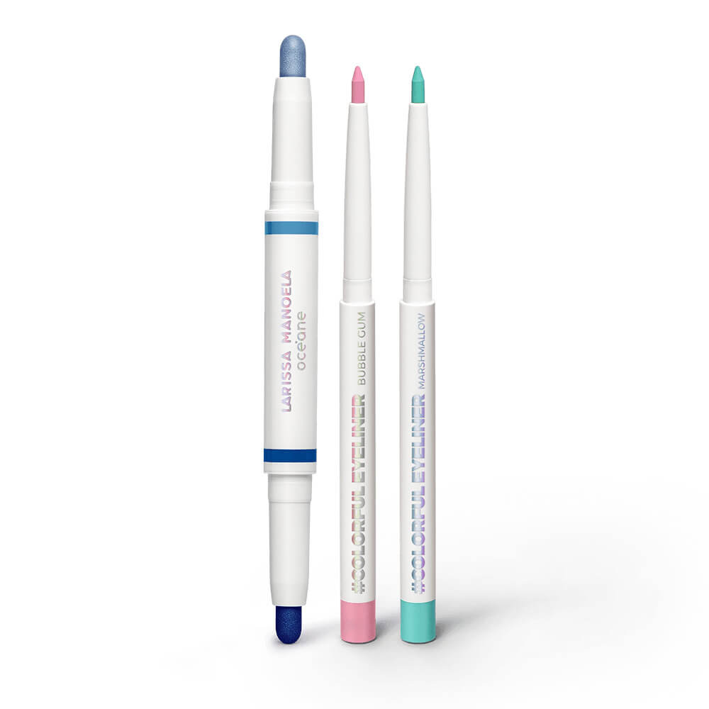 O kit sombra em bastão dupla azul claro e azul marinho + lápis delineador rosa + lápis delineador azul larissa manoela by océane contém: