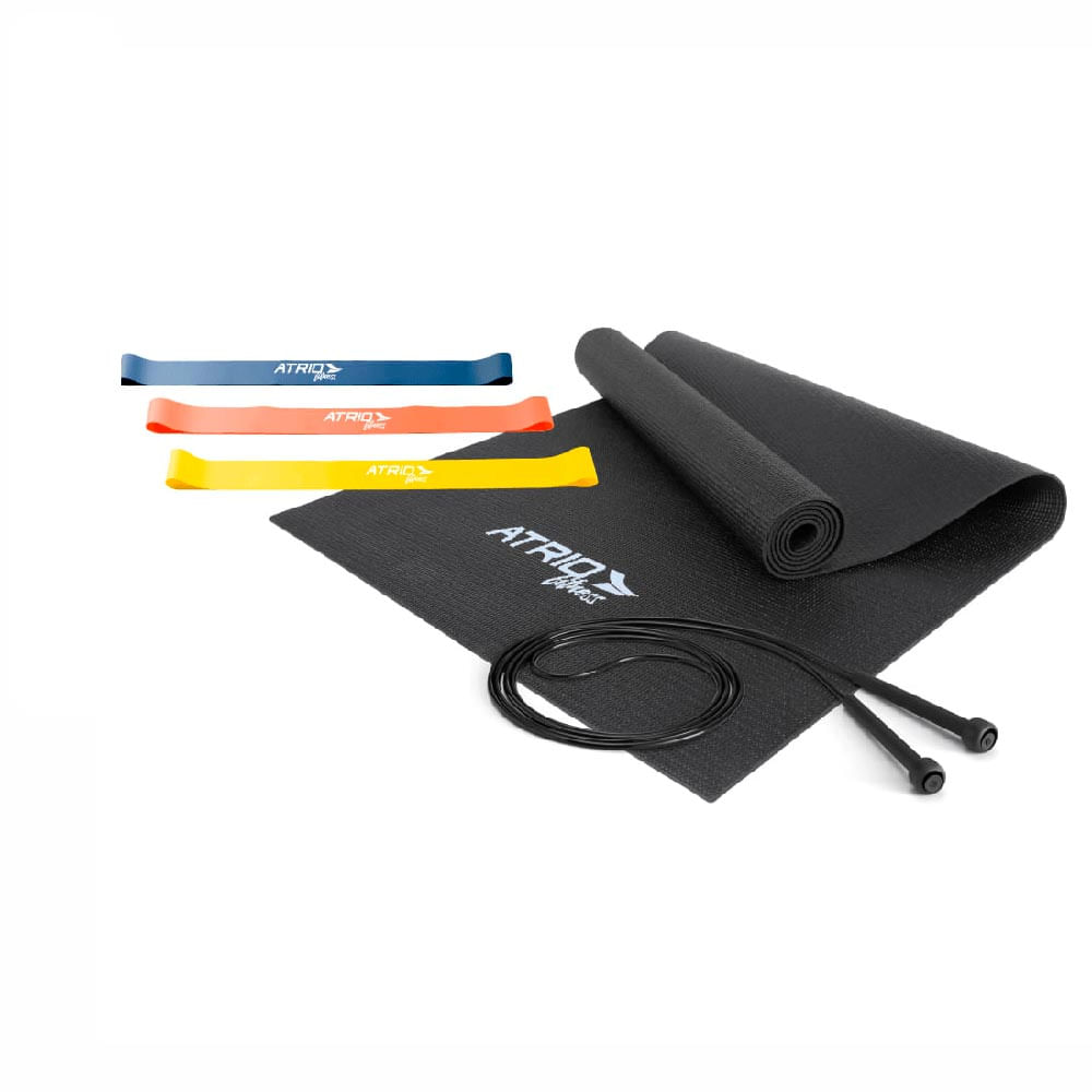 - Corda para exercícios aeróbicos, mini bands para tonificação muscular e tapete para yoga e pilates