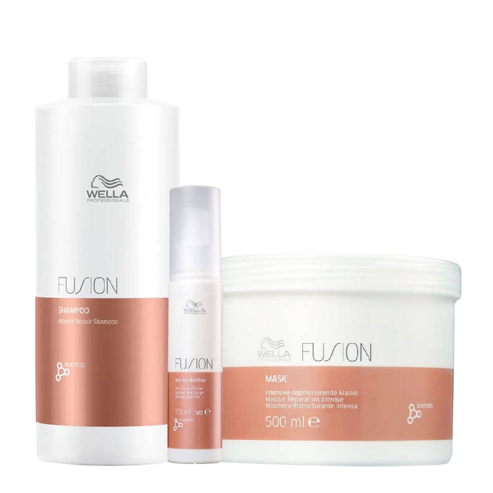 O Kit Wella Professionals Fusion com 3 produtos, tem 1 Shampoo de 1000 ml, 1 Máscara de 500 ml e Tratamento de Reconstrução Fusion Amino Refiller de 70 ml. Com tamanho de salão e uso profissional. O Shampoo oferece uma limpeza suave que não compromete a saúde da fibra capilar, a Máscara de Reparação devolve força e maciez aos fios extremamente fragilizados e o Tratamento de Reconstrução Amino Refiller é um repositor de aminoácidos potente para recuperar a fibra capilar. Para cabelos secos, danificados ou quimicamente tratados. Com a Linha Fusion você recupera e fortalece os fios.