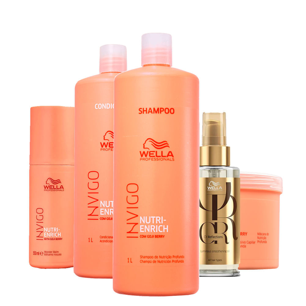 O Kit Wella Professionals Invigo Nutri Enrich é composto por 1 Shampoo de 1000 ml, 1 Condicionador de 1000 ml, 1 Máscara de 500 ml, 1 Leave-in de 150 ml e 1 Óleo Capilar Wella Professionals Oil Reflections Luminous Smoothening de 100 ml.