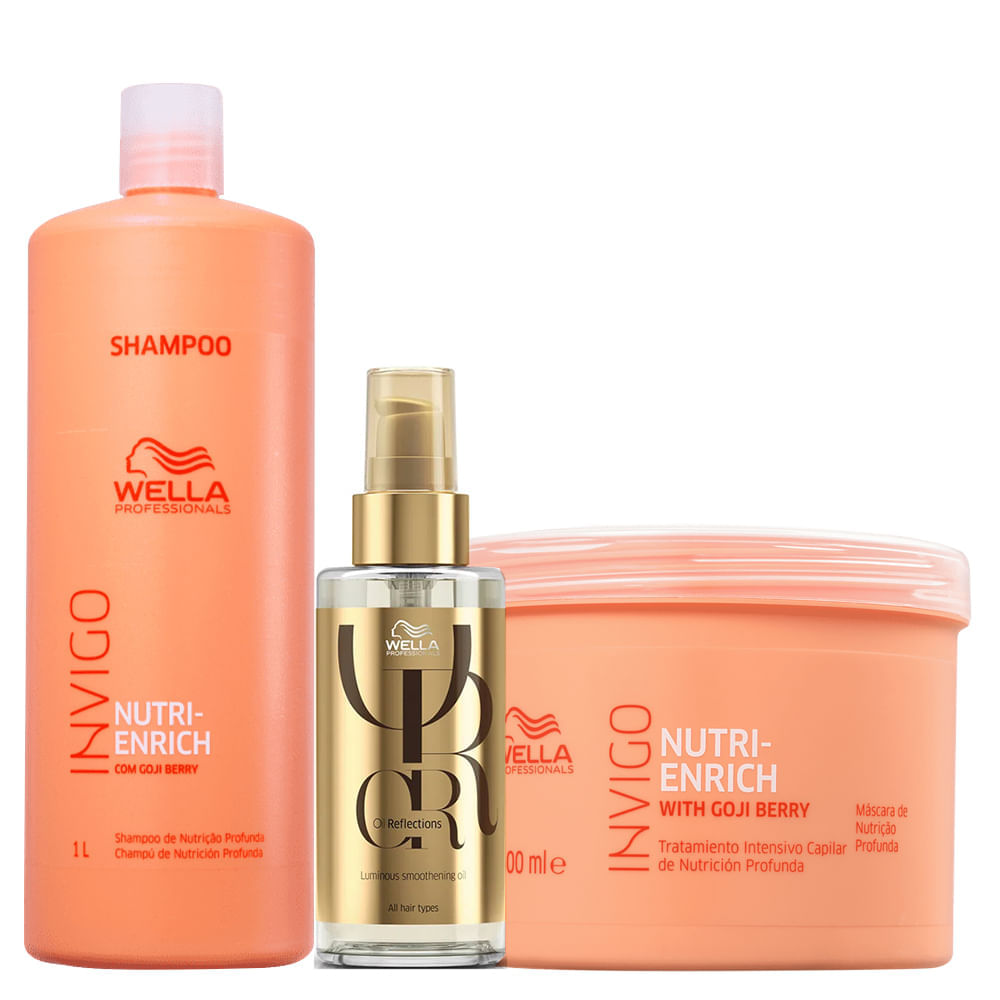 O Kit Wella Professionals Invigo Nutri Enrich contém 1 Shampoo de 1000 ml, 1 Máscara de 500 ml e 1 Óleo Capilar Wella Professionals Oil Reflections Luminous Smoothening de 100 ml