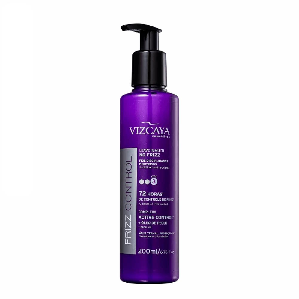 Leave-in Vizcaya Multi Frizz Control proporciona nutrição, hidratação, repara os fios ressecados enquanto melhora a textura e a maleabilidade. Além disso, forma uma película ao redor da fibra capilar e protege do calor do secador e da chapinha.