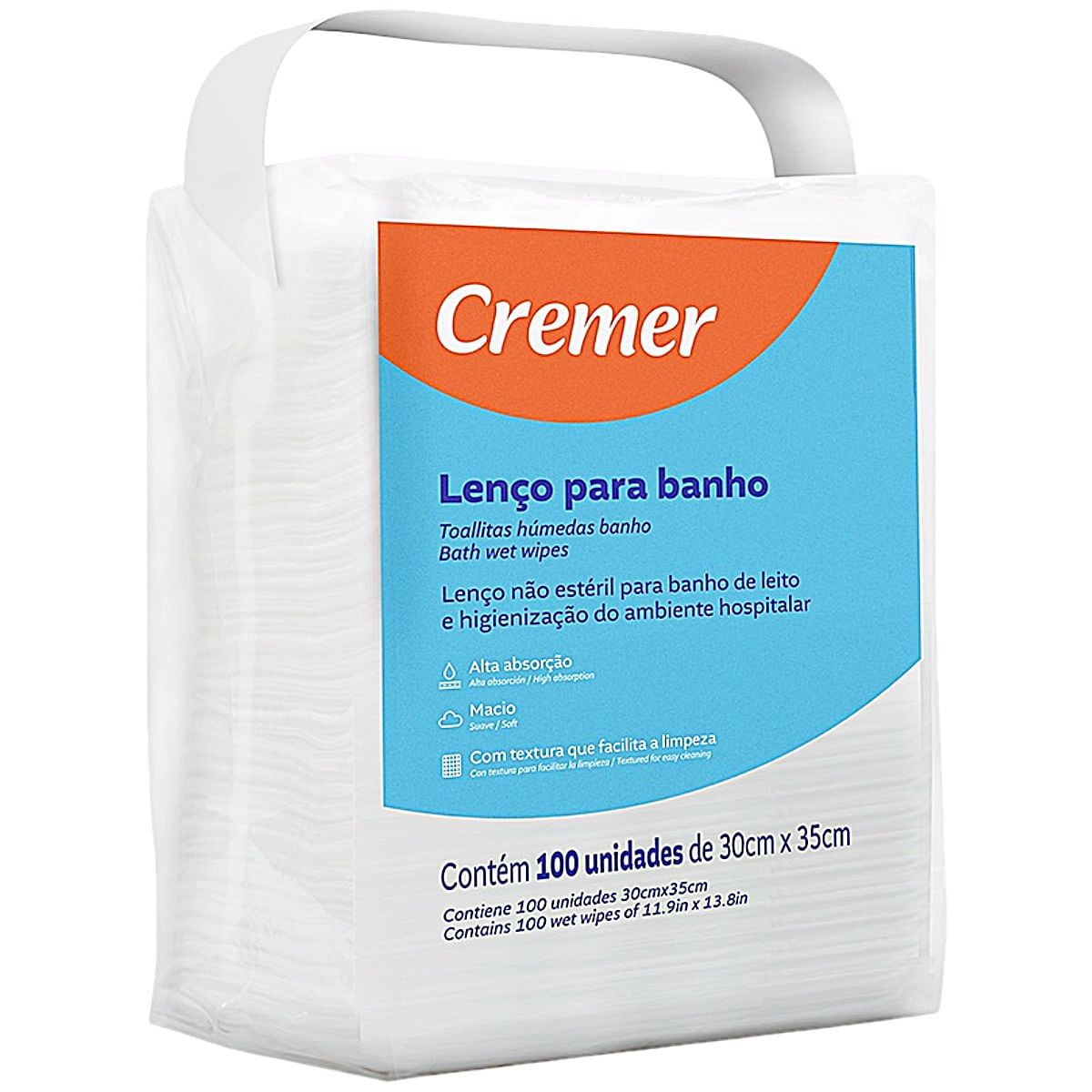 O Lenço para Banho Cremer foi criado para higiene e assepsia de pacientes em leitos. Também pode ser usado na limpeza de ambientes, proteção de caixa cirúrgica ou secagem de instrumentos cirúrgicos. Composto de tecido macio e de rápida absorção que não irrita a pele.