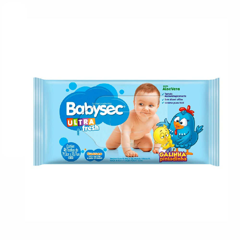 A Toalha Umedecida Babysec Ultrafresh foi desenvolvida com suaves ingredientes, ideais para higiene diária e durante a troca de fraldas do seu bebê. Sua fórmula enriquecida com Aloe Vera auxilia na hidratação e remove delicadamente as impurezas, mantendo a pele do bebê sempre macia e saudável. Possui sistema puxa fácil, sem alcóol etílico, é testada dermatologicamente e contém Aloe Vera.
