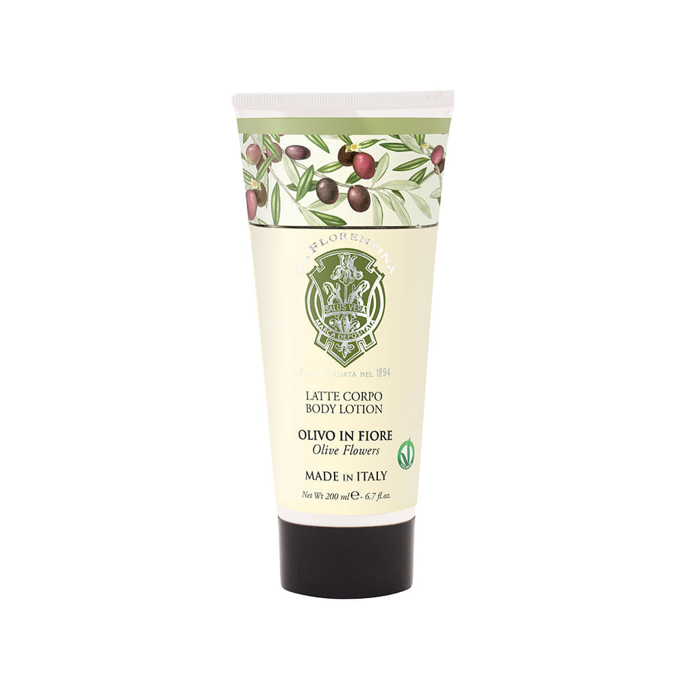 O produto é uma loção corporal La Florentina que hidrata a pele e deixa um agradável aroma de flor de oliveira.