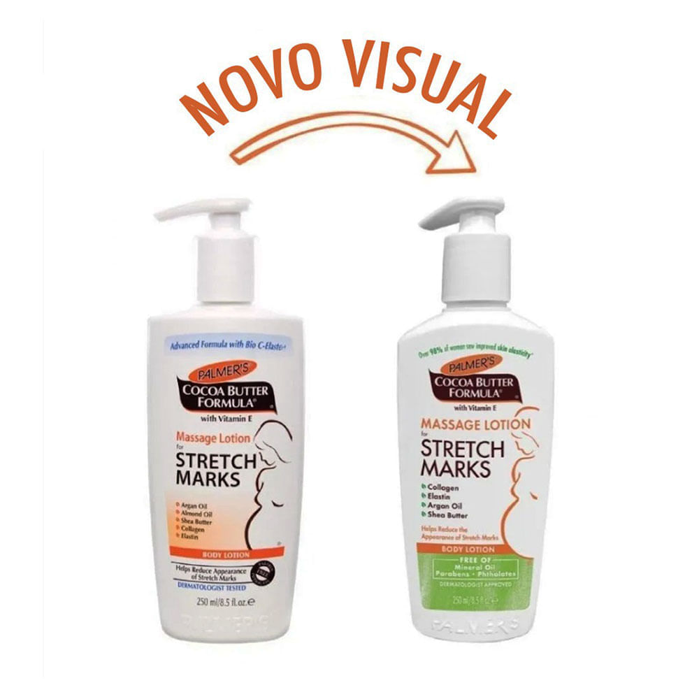 Cocoa Butter Massage Lotion for Stretch Marks é uma loção corporal nutritiva para tratamento de marcas de estrias durante e após a gravidez ou estrias causadas por variações de peso. A Loção para estrias possui em sua fórmula manteiga de cacau Palmer que ajuda a reduzir a aparência de estrias com uma mistura especial de manteiga de cacau pura, vitamina E, manteiga de karité e Bio C-Elast e Bio C-Elast é uma poderosa combinação de colágeno, elastina, Centella Asiatica, óleo de amêndoa doce e óleo de argan. Esta loção não gordurosa, para todo o corpo, ajuda a melhorar a elasticidade e flexibilidade da pele alongada durante e após a gravidez. Também é recomendado para estrias associadas a flutuações de peso.Com Colágeno, Elastina, Centella Asiática, Óleo de Argan, Óleo de Amêndoas Doces, Manteiga de Karité, Extrato de Cacau puro e Vitamina E em sua fórmula, essa loção hidratante ajuda a reduzir o aparecimento de estrias em todo o corpo, além de aumentar a elasticidade da pele em 97% das pessoas. Associados ao uso regular da loção.Indicado:Para todos os tipos de pele.Ativos:• Manteiga de cacau: um hidratante rico e natural que deixa a pele macia e sedosa, transformando até as áreas mais ásperas e mais secas em pele macia e suave.• Vitamina E: um poderoso antioxidante que ajuda a melhorar a aparência de cicatrizes, estrias e imperfeições na pele, dando uma aparência mais uniforme e tonificada.• Colágeno e Elastina: melhora a elasticidade, alongabilidade e firmeza da pele e leva à melhora no tom, flexibilidade e aparência da pele em geral.• Centella Asiatica: um extrato de folha natural, ajuda a proteger e revitalizar fibras de colágeno e elastina. Recomenda-se como ingrediente ideal para o cuidado das estrias.• Óleo de amêndoa doce: um emoliente não-gorduroso, super hidratante facilmente absorvido na pele. Suas propriedades antimicrobianas ajudam a reduzir as chances de cicatrizes e marcas na pele.• Óleo de Argan: tem duas vezes mais Vitamina E como azeite, e é rico em ácidos graxos essenciais e antioxidantes vitais. Ajuda a suavizar e condicionar a pele enquanto reduz as cicatrizes.Modo de Usar:Passar suavemente sobre a pele limpa. Pode ser usado na barriga, quadril, coxas e busto.