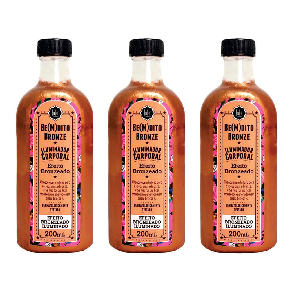 O kit contém:3- Iluminador Corporal Lola Cosmetics - Be(M)dito Bronze - 200mlBe(M)dito Bronze Iluminador Corporal Efeito BronzeadoChegou quem faltava para os seus dias: o bronze.« Se não for pra ficarbronzeada o ano todo nem quero brincar ». O que sou: Iluminador corporal para uma pele iluminada com efeito bronzeado natural e instantâneo. O que mais você precisa saber: Além de nutrir e hidratar, deixo sua pele dourada e iluminada. Perfeito para quem quer o bronze em dia o ano todo, assim como eu. #FicaDica: Se você quiser um pouco mais de brilho espere secar e faça uma cobertura extra com nossa Geleia Corporal, sua pele vai ficar #LuxoPoder&Glória.Atenção: Não sou um bronzeador de praia. Sou um iluminador corporal que proporciona um efeito bronzeado que sai após lavar.Uso sugerido: Aplique uma quantidade generosa nas mãos e espalhe pelo corpo em movimentos circulares. Espere secar antes de se vestir. Para retirar basta lavar com água e sabão.- Vegano- Cruelty Free- Com Glitter Biodegradável- Com Embalagem Reciclável que se decompõe em até 5 anos!
