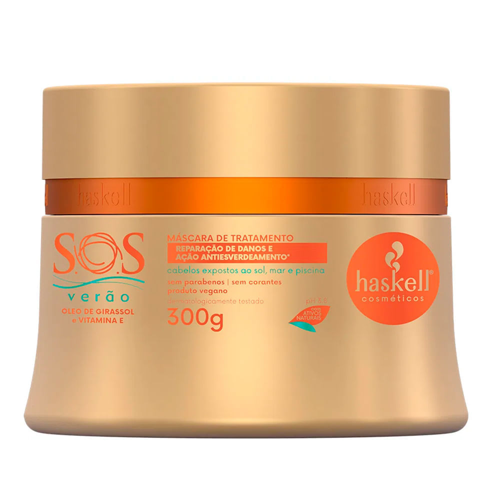 A Máscara Capilar De Tratamento Haskell Sos Verão é um tratamento capilar especialmente desenvolvido para prevenir e tratar danos causados aos cabelos expostos ao sol, mar e piscina.