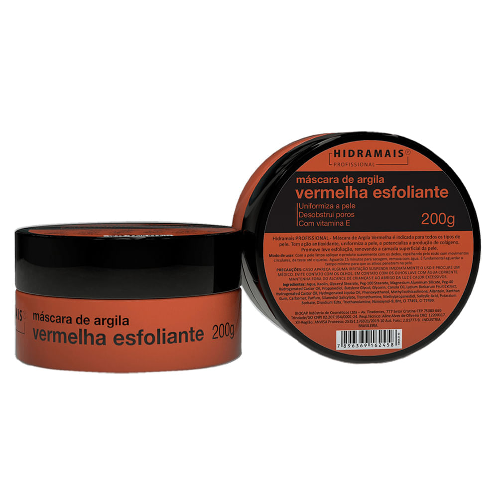 Ma´scara de Argila Vermelha Hidramais e´ indicada para todos os tipos de pele. Tem ac¸a~o antioxidante, uniformiza a pele, e potencializa a produc¸a~o de cola´geno. Promove leve esfoliac¸a~o, renovando a camada superficial da pele.Indicado:Para todos os tipos de pele.Benefícios: Ativa a microcirculação da pele Elimina impurezasPromove leve esfoliaçãoModo de Usar: Com a pele limpa aplique o produto suavemente com os dedos, espalhando pelo rosto com movimentos circulares, da testa até o queixo. Aguarde 15 minutos para secagem, remover com água. É fundamental aguardar o tempo mínimo para que os ativos penetrem na pele. Sobre a Marca: Hidramais Profissional, performance e tecnologia para quem é profissional em bem estar. Esta é a Hidramais Profissional, que possui uma linha completa desenvolvida especialmente para profissionais de estética e fisioterapia. São mais de 30 produtos voltados para massagem corporal e facial que dão aos profissionais uma ótima opção no mercado, aliando qualidade e praticidade.