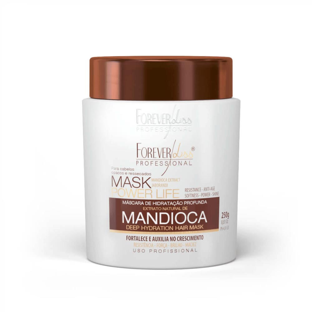 A Máscara Hidratante de Mandioca Power Life Forever Liss foi desenvolvida com ingredientes ricos em vitaminas e minerais, como Extrato de Mandioca e Jaborandi.
