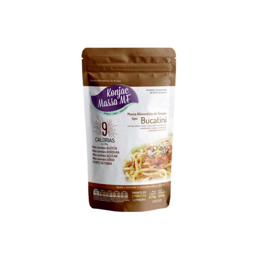 A Massa tipo Bucatini Konjac é um produto de origem vegetal, alternativa às massas tradicionais. Produzida 100% com fibra solúvel de Glucomannan, que após passar por um processo de hidratação é moldada no formato bucatini. Possui apenas 9 kcal a cada 100g, é fonte de fibras, zero carboidrato, glúten e sódio. Ideal para quem busca uma alternativa saudável e baixa em calorias e carboidratos para as refeições diárias, mas não abre mão do sabor.