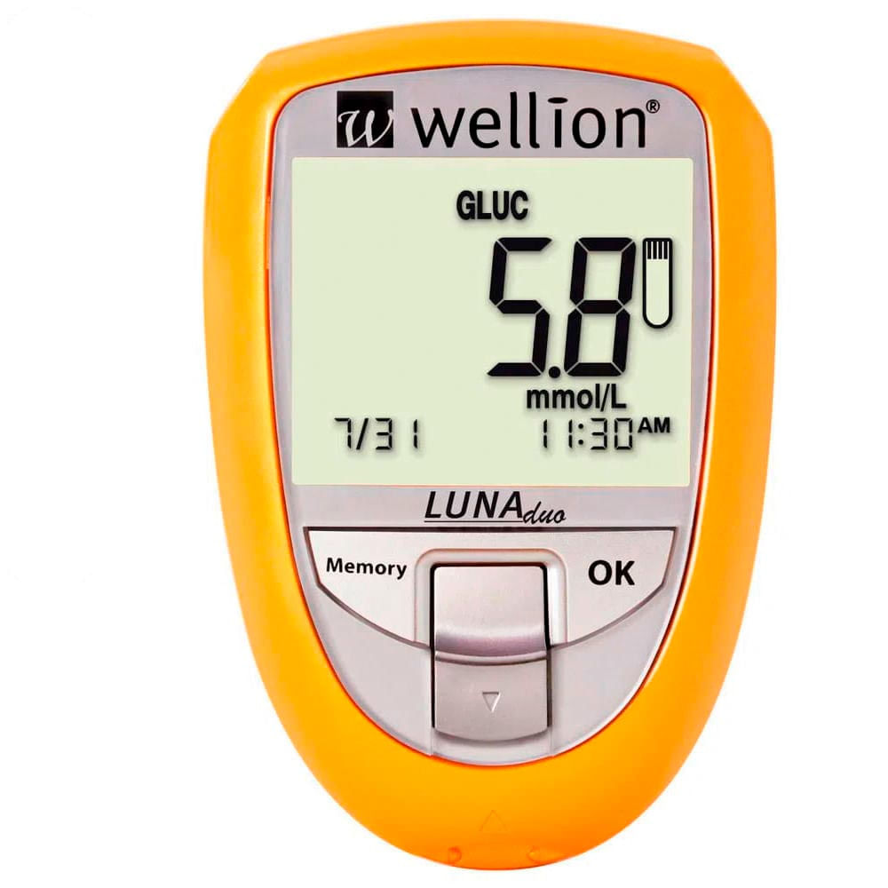 O produto em questão é o MEDIDOR DE COLESTEROL E GLICOSE LUNA DUAL - WELLION. Este é um medidor de glicose no sangue com a função adicional de medição de colesterol.