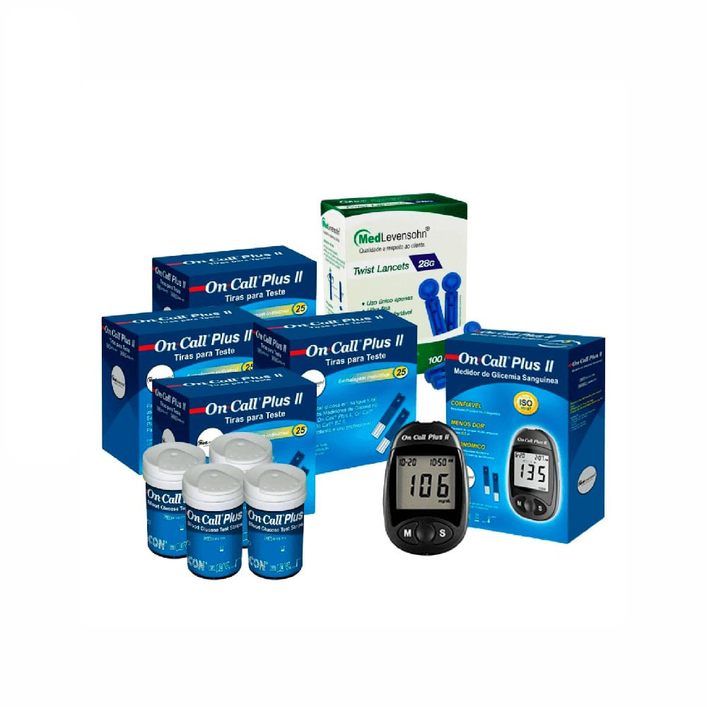 Kit Medidor De Glicose On Call Plus II + 200 Tiras On Call Plus II + 100 lancetas 28g