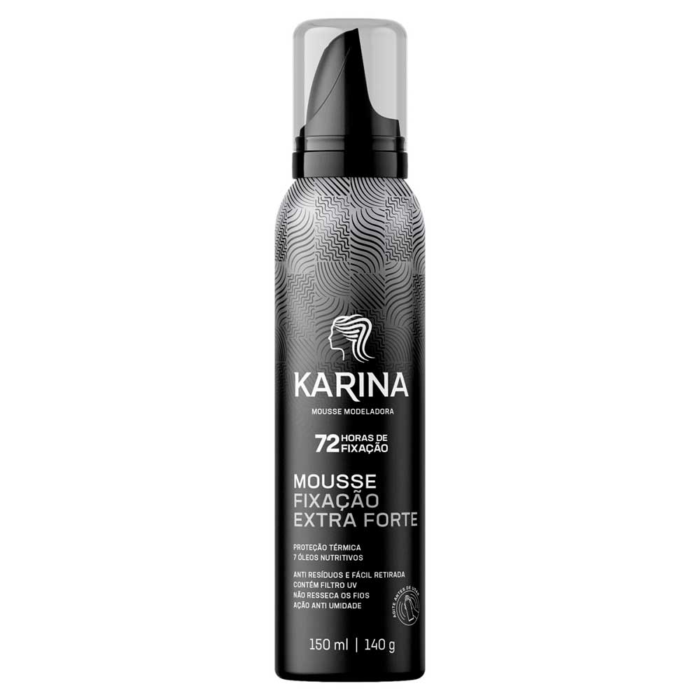 Mousse Karina Fixação Extra ForteO que é e para que serve?A Mousse Karina Fixação Extra Forte é um produto inovador desenvolvido especialmente para modelar, estilizar e texturizar seus cabelos com eficiência. Este mousse oferece uma fixação impressionante de até 72 horas, garantindo penteados impecáveis que duram por muito mais tempo. Seja qual for o tipo do seu cabelo, este produto facilita a preparação, montagem e finalização dos fios, proporcionando resultados perfeitos e duradouros.Quais os benefícios do Fixação Extra Forte?- Proporciona uma fixação extra forte que mantém seu penteado intacto durante todo o dia ou noite;- Protege os fios do calor excessivo das ferramentas de styling;- Ajudam a combater o ressecamento dos cabelos enquanto promovem nutrição intensa aos fios;- Assegura um acabamento limpo sem deixar resíduos indesejados nos cabelos.Modo de uso:1. Utilizar a Mousse Karina Fixação Extra Forte é simples e prático: retire a tampa do produto e direcione a válvula para a palma da mão pressionando-a por cerca de três segundos até formar uma espuma densa de aproximadamente 5 cm de diâmetro. 2. Aplique nos cabelos úmidos antes do secador ou chapinha para garantir proteção térmica máxima durante o processo de modelagem ou aplique sobre os cabelos secos após finalizar o penteado desejado para garantir maior fixação.