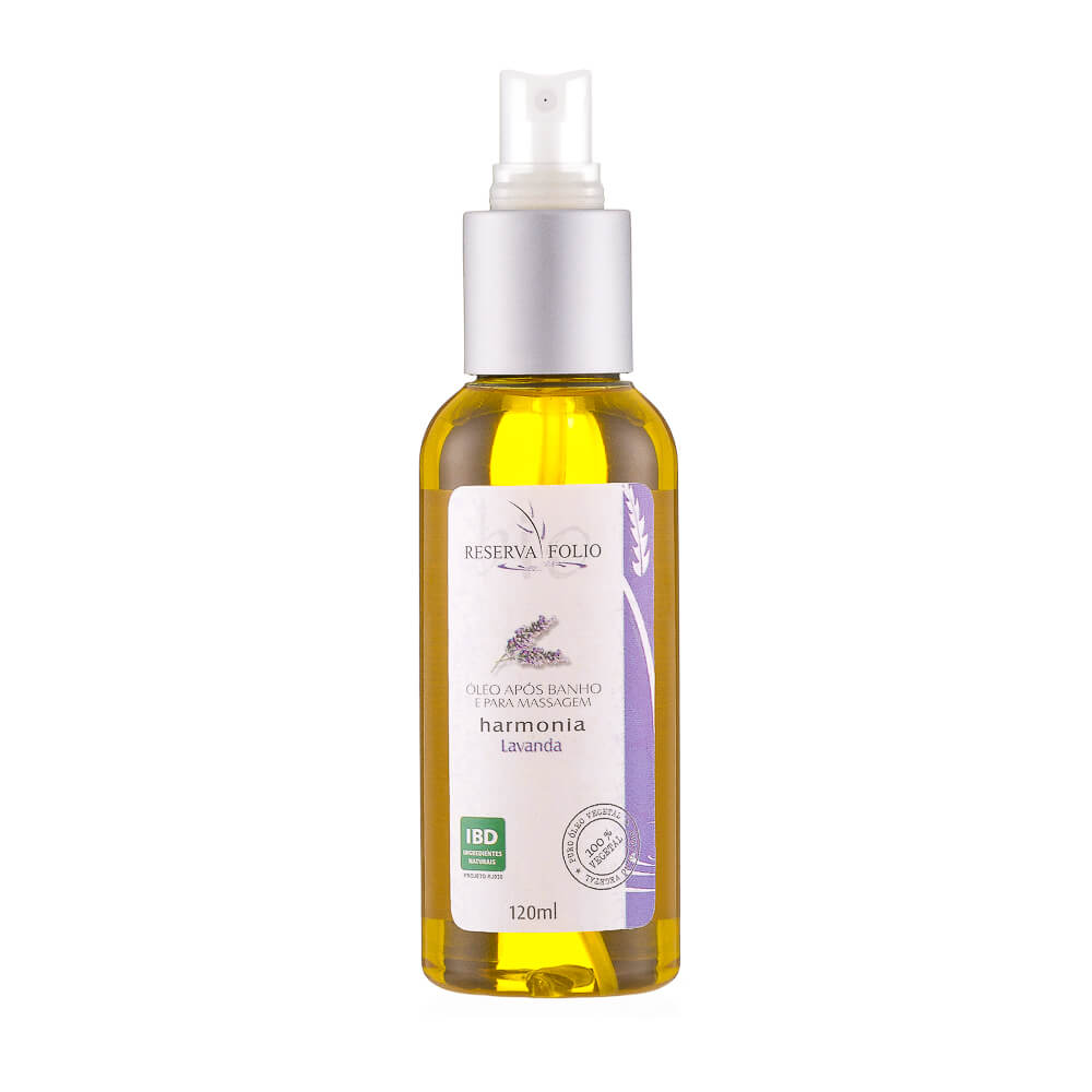 O Óleo após Banho e para Massagem Natural Harmonia da Reserva Folio possui uma poderosa combinação de óleos de semente de uva, castanha do Pará, linhaça e amêndoa doce, ricos em vitaminas A e E, proteínas e antioxidantes naturais e o famoso óleo essencial de lavanda, muito conhecido na aromaterapia pelas suas propriedades relaxantes. Nutre e hidrata a pele, protege contra o ressecamento e a formação de radicais livres, além de conferir uma agradável sensação de bem estar.