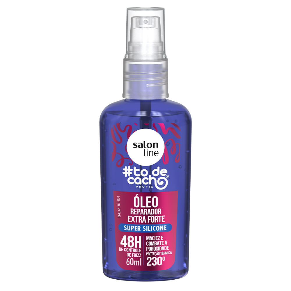 O Óleo Reparador Extra Forte Salon Line Todecachos Super Silicone 60ml é a resposta para cachos incrivelmente saudáveis e irresistíveis. Desenvolvido pela Salon Line, este poderoso óleo reparador oferece uma reparação capilar intensa, proporcionando vitalidade e brilho extra aos cachos. Sua fórmula é enriquecida com super silicone, garantindo resultados extraordinários.Indicação: Especialmente formulado para cabelos que necessitam de um tratamento reparador extra, o Óleo Reparador Extra Forte é a escolha ideal para quem busca um toque de maciez e brilho intenso.Direção olfativa: froral suave.Especificações:_x000D_ _x000D_ - Fórmula concentrada com silicone de alta performance;_x000D_ - Textura leve;_x000D_ - Absorção rápida e eficaz;_x000D_ - Livre de parabenos.Benefícios:_x000D_ _x000D_ - Reparação intensa dos fios danificados;_x000D_ - Proteção contra as agressões externas;_x000D_ - 48 Horas de Controle de frizz;_x000D_ - Controle do volume;_x000D_ - Proteção térmica 230°;_x000D_ - Brilho radiante e aspecto saudável.Modo de usar: Aplique algumas gotas do Óleo Reparador Extra Forte Todecachos Super Silicone nas palmas das mãos e distribua uniformemente nos cabelos secos ou úmidos, concentrando nas pontas e evitando a raiz. Pode ser utilizado como finalizador ou reforço de brilho ao longo do dia.Sobre a marca:A Salon Line, uma das maiores fabricantes de cosméticos do Brasil, acompanha a evolução da mulher brasileira há mais de 15 anos. Toda essa vivência faz da empresa uma profunda conhecedora do universo feminino. A Salon Line está sempre investindo em novas tecnologias e produtos para oferecer o que há de melhor no segmento cosmético mundial. Empresa 100% Nacional, tem como objetivo especializar-se na beleza das mulheres brasileiras, desenvolvendo produtos de alta tecnologia e valorizando todas as belezas.
